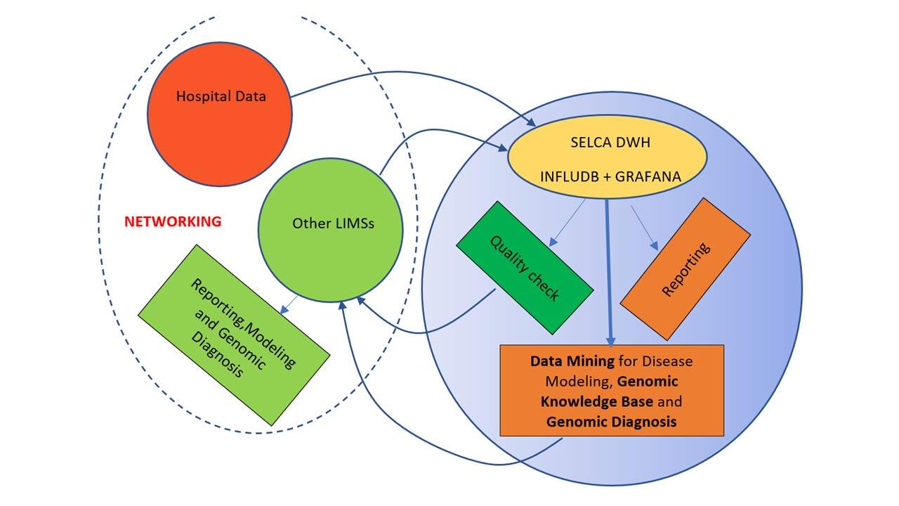 Tutti dati contenuti nel DWH sono analizzati da SELCA MINER per proporre modelli predittivi dell'evolversi di malattie croniche (ad esempio diabete). L'utilizzo delle misure genomiche (file FastQ) segue invece un percorso diverso: prima si crea in fase di learning una base di conoscenza che sarà utile a classificare/diagnosticare successivamente in fase di test i campioni genomici prelevati. Grazie a SElCA NET i referti e le valutazioni predittive saranno inviati ai dottori interessati, mentre i dati provenienti da altri LIMS e da cartelle ospedaliere verranno immagazzinati opportunamente nel DWH.